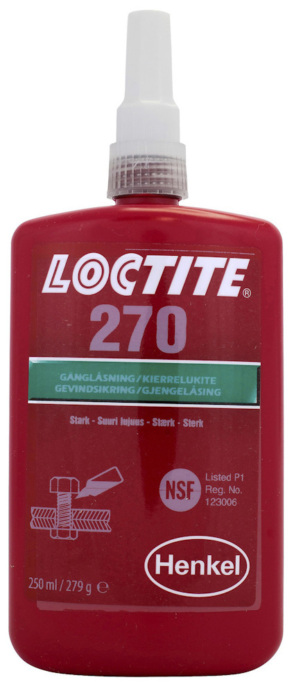 270 Gänglåsning. Hög styrka. Framtagen för maximal effektivitet vid fixering och tätning av skruvar, muttrar och pinnskruvar. Möjliggör demontering med handverktyg. Produkten används för permanentlåsning av monteringar där inget får lossna. Den fungerar på alla metaller, inklusive passiva material (t.ex. rostfritt stål, aluminium och pläterade ytor). Tester visar att den är motståndskraftig mot mindre föroreningar av industrioljor, t.ex. maskinoljor, korrosionsskyddsoljor och skärvätskor. Livsmedelsgodkänd enligt P1 NSF reg. nr: 123006. Färg: grön. Max. gängstorlek: upp till M20. Arbetstemperaturintervall: -55°C till +180°C. Kan demonteras genom uppvärmning till 250°C. Lossbrytningsmoment 33 Nm. Fixeringstid; stål: 10 min, mässing: 10 min, rostfritt stål: 150 min. Hanteringsstyrka (vid 22°C) efter 3 tim. Tixotropi: nej. Fluorescens: ja. Viskositet: 400-600 mPa•s.
