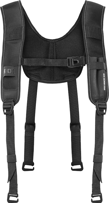 För användning med Ergo bälte 127710 samt fickor och hållare / Ryggdel med elastiska reglerbara remmar, längd 35 cm / Penn- och verktygshållare / Reglerbar bröstrem / Reglerbara remmar fram, längd 42 cm / Mjuk insida i perforerat luftigt material / Smuts- och vattenavvisande.