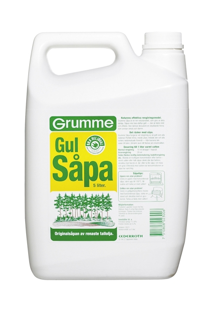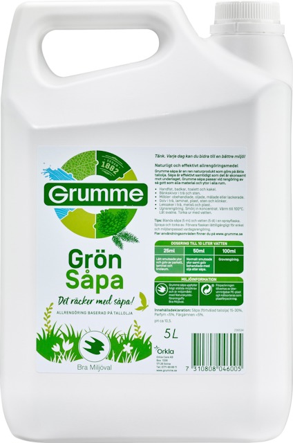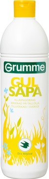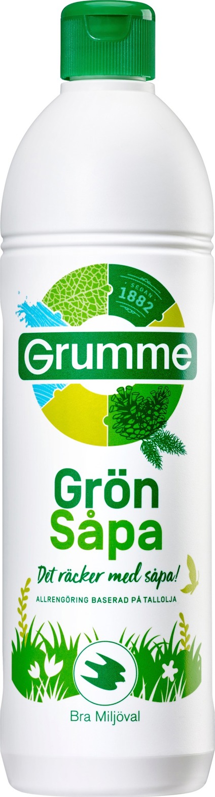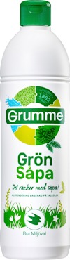 Grumme såpa är ett naturligt och mycket effektivt allrengöringsmedel som har använts i svenska hem i mer än 125 år. Vår såpa är ett mycket användningsbart och milt rengöringsmedel som är tillverkat av tallolja. Du känner igen lukten när det har städats med grönsåpa. Förutom klassikerna grönsåpa och gulsåpa finns nu även en fräsch citronsåpa. Grumme såpa är fri från konserveringsmedel och helt ofarlig att använda. Grumme såpa är också helt biologiskt nedbrytbar och miljömärkt med Bra Miljöval.