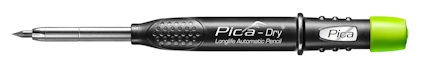 Märkpenna Pica Dry Dry. En penna för uppmärkning i djupa hål. Djuphålsmärkare med 2,8 mm tjockt grafitstift som standard. Spetsen är så lång att man enkelt kommer igenom konsoler för t ex skruvhål. Passar också utmärkt som ersättare till timmermanspenna. För märkning på de flesta ytor/material t ex glatta ytor som kakel, klinker och glas mm. Fäster även på smutsiga och oljiga ytor. Stiftet matas fram med en enkel tum-tryckning. Hylsan är försedd med bältesclips för enkel förvaring i byxa eller verktygsficka. Reservstift Röd, Gul och Grafit är vattenlösliga och kan lätt torkas av från glatta ytor med en fuktig trasa. Notera att reservstiften är mycket känsliga för väta och värme. Stiften tål max 30°- 40° för att behålla sina egenskaper. De kan då svälla upp i matarkanalen och fastna. Det åtgärdas enkelt genom att spola rent kanalen under rinnande hett vatten och sen rengöra/torkas försiktigt med tex. en piprensare. Tänk på att kanalen måste vara helt torr innan nytt stift förs in. Grafitstiftet har hårdhetsgrad 2B, lite mjukare än en standardhård timmermanspenna, och fäster därmed bättre på fler underlag. Det gula reservstiftet är utmärkt för märkning på mörka ytor. Gul och röd reservstift är känsliga mot värme då de blir mjuka. Specialstift Vit, Blå och Grön är permanent vattenfasta (Water Jet Resistent) och tål högt vattentryck bl a när man skär i sten och kakel. Reservstiften/Specialstiften finns var färg för sig eller sorterade (gul/röd/grafit) eller (vit/grön/blå). Användarvänlig design – lång spets för att komma åt och en rejäl hylsa med starkt clips som möjliggör hantering med en hand. Lång livslängd – fyll bara på med nya stift Med en tumtryckning matas stiftet enkelt fram. Användbar till så gott som all märkning genom möjligheten att välja stift med olika egenskaper. Kraftig färg gör den lätt att hitta om man lagt den ifrån sig. Bästa fungerande märkpennan på marknaden enligt hantverkare.