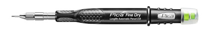 Pica Fine Dry med mycket liten stiftdiameter (0.9 mm) är idealisk för precis märkning utan behov av vässning. Fem grafitstift (HB) medföljer märkpennan. Integrerat stort radergummi för snabb och praktisk radering. Det inbyggda damm- och vattenskyddet (tryckknapp som fungerar som skyddslock och kropp med tätningsring) skyddar märkpennans inre mekanik mot påverkan från miljön på arbetsplatsen och ger avsevärt längre livslängd. Hylsans lock är tillverkat av extremt tålig specialplast och har extra stark clip som säkerställer säker fastsättning i byxfickan. Enkel att använda med en hand.