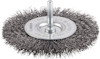 Fin finish på stål - Stålborsten ger en fin ytfinish. Den har vågformad tråd för lätt till medeltung rengöring på små ytor och är idealisk för att avlägsna anlöpningsfärg på svetsfogar. Stålborsten passar för rengöring av mindre stålytor, kanter och spår med hög rotationsfrekvens. Den är också lämplig för rostborttagning, ruggning, mattslipning och färgborttagning. Den kan användas med borrar med 6 mm skaft. Borsttrådarna finns i olika tjocklek beroende på hur mycket som ska slipas. Tjockare trådar är aggressivare och ger grövre ytfinish medan tunnare trådar ger finare och jämnare ytresultat. Cylindriskt skaft som passar till trebackschuck.