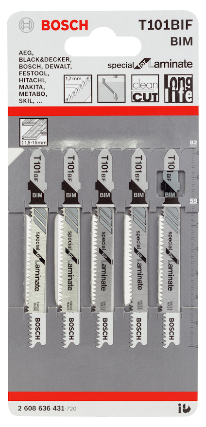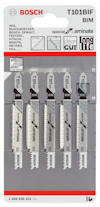 Rena snitt i hårda träslag - T 101 BIF Special for Laminate sticksågblad gör rena, raka snitt i trä. Dess precisionsslipade tänder med dubbelkonisk kropp ger rena snitt. Dess fullt härdade tandrad av HSS (snabbstål) är hopfogad med dess kropp av högelastiskt HCS (stål med hög kolhalt) till en bimetall, som gör att bladet lämpar sig för att såga hårt material såsom golvlaminat. Dessutom minskas rivskadorna tack vare den spetsiga tandutformningen. Det har fin tandutformning (1,7 mm) för sågning i flera olika massiva trämaterial med tjockleken 2–30 mm. För användning med sticksågar med T-skaftsystem för fasthållning. Passar alla sticksågar med T-skaft.
