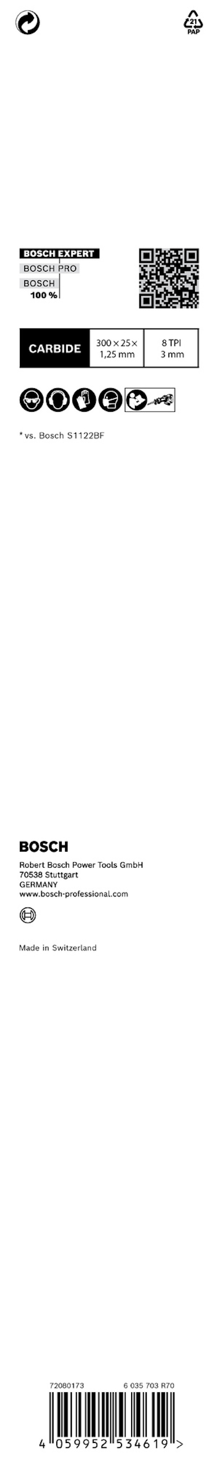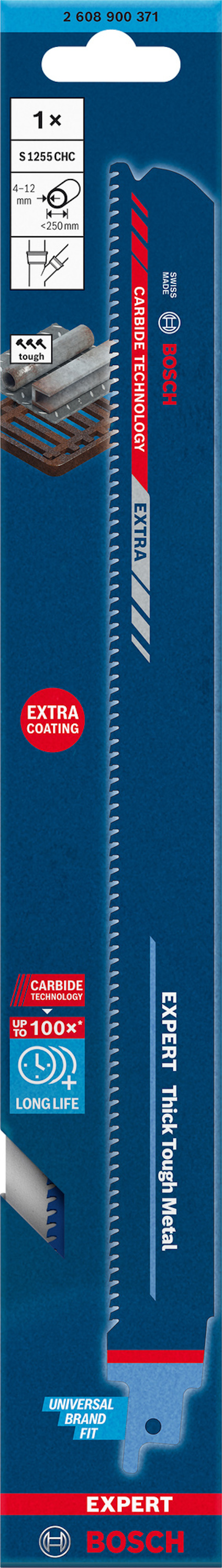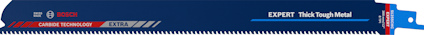 EXPERT ‘Thick Tough Metal’ S 1255 CHC tigersågblad, 1 st Håller upp till 100 gånger längre än S1122BF-blad från Bosch i tuffa material - Att såga grov metall som stålprofiler eller tunga gjutjärnsrör är förmodligen inte det du gör helst på jobbet. VVS-are, renoverare och rivningsarbetare vet hur krävande den här arbetsuppgiften är, även med en kraftfull tigersåg. EXPERT 'Thick Tough Metal' sågar inte bara grov metall utan ger en exceptionell livslängd i de mest krävande tillämpningar. Extrem hållbarhet är inbyggd i bladet med Bosch Carbide Technology. Tänder i hårdmetall svetsas på en extra robust och bred kropp i tjockt stål – perfekt för raka snitt och hållbarhet. Yrkeshantverkare som inte har använt Boschs hårdmetallblad tidigare blir förvånade över tåligheten hos Bosch EXPERT ‘Thick Tough Metal’ tigersågblad. Med Bosch EXPERT 'Thick Tough Metal' tigersågblad kan det faktiskt bli riktigt kul att skära i tjockt stål och gjutjärn. Passar alla tigersågar med S-skaft.
