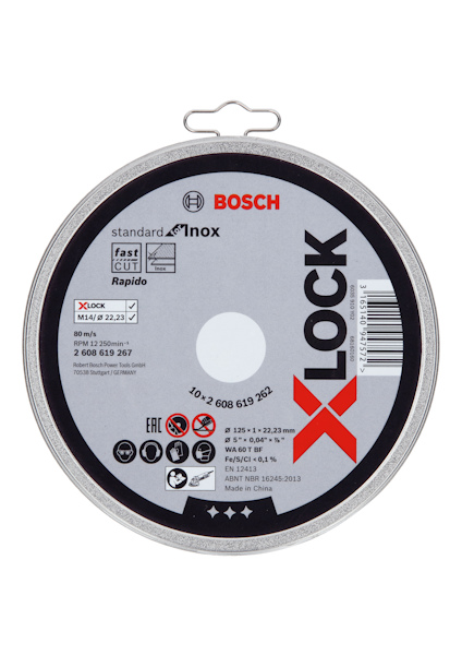 Tillförlitliga resultat i rostfritt stål - X-LOCK Standard for Inox kapskiva ger pålitliga resultat i rostfritt stål. Skivans tunna kant möjliggör smidig och enkel kapning. Dessutom är skivan fri från fyllnadsmedel som innehåller järn, svavel och klor. Bosch kapskivor uppfyller de högsta säkerhetskraven, till exempel EN 12413. X-LOCK kapskivor passar även på vinkelslipar av standardtyp. Det går snabbt och enkelt att byta kapskivor tack vare det nyckelfria X-LOCK-systemet. Klicka den på plats med X-LOCK – marknadens snabbaste system för byte av tillbehör. Passar även till vinkelslipar med mutter och gänga.