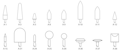 Slipstift Norton A Typ A. Större fasonerade, keramiskt bundna slipstift av aluminiumoxid, med 6 mm spindel. Norton Quantum (NQ). Slipstift med NQ slipmedel ger minst 33% längre livslängd i kombination med mer än 30% högre avverkning än slipstift av aluminium-ozid. Extremt friskärande vilket ger minimal värmeutveckling. 86A Slipstift av aluminium-oxid för ett allmänt användningsområde. För slipstiften anges i tabellen max. tillåtet varavtal för 13 mm fri spindellängd. Med fri spindellängd menas avståndet från slipkroppen till chucken.