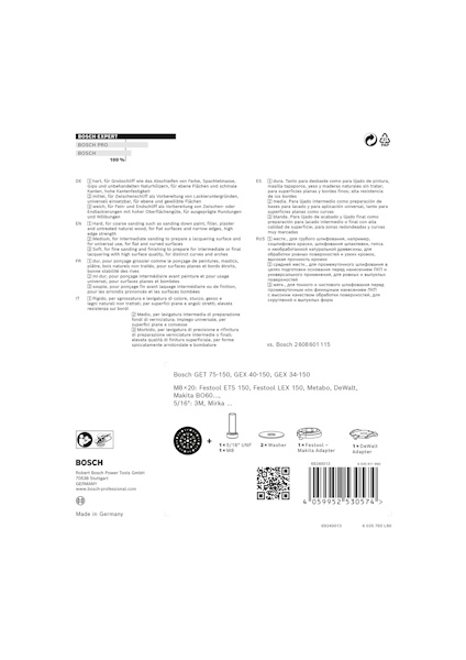 EXPERT multihål stödrondell Universal 150 mm, medium Håller upp till 2 gånger längre än Bosch 2608601115-stödrondell - Genom att förse slippappren med många hål uppnås ökad effektivitet, längre livslängd och bättre arbetsmiljö med mindre mängd damm. Men om du vill utnyttja fördelarna med den här ”dammreducerande” revolutionen fullt ut behöver du en stöddyna i samma klass. EXPERT multihål stödrondell är en integrerad del av Boschs Particle Control-system. De till synes slumpmässigt placerade hålen är resultatet av noggrann forskning: Det är matematiskt uträknat att tillräckligt många hål alltid hamnar i linje med pappret för att säkerställa optimal dammutsugning. Det betyder att dina slippapper inte täpps igen och håller längre. Den finns i hårda, medelhårda och mjuka versioner, beroende på vilken typ av slipning du ska utföra. Bosch EXPERT multihål stödrondell för excenterslipar är oumbärliga för dig som vill gå med i dammreducerande slipklubben. Till medlemsförmånerna hör bland annat bättre luft, arbete av hög kvalitet och slippapper med längre livslängd. 150 mm stödrondell för excenterslipar, med adaptrar som passar de flesta verktygsmärken.
