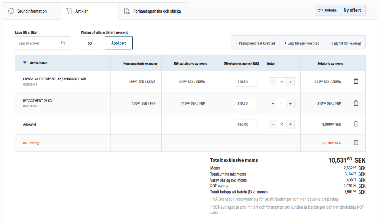Vårt offertverktyg är framtaget för att passa proffsbyggarens vardag. Du skapar enkelt en offert direkt i systemet och lägger till de artiklar och produkter du vill erbjuda. Systemet hämtar automatiskt prisinformation och artikeldata, så att du slipper onödigt handarbete. När offerten är klar kan du skapa en varukorg direkt från offerten – redo att omvandlas till en beställning när kunden säger ja.